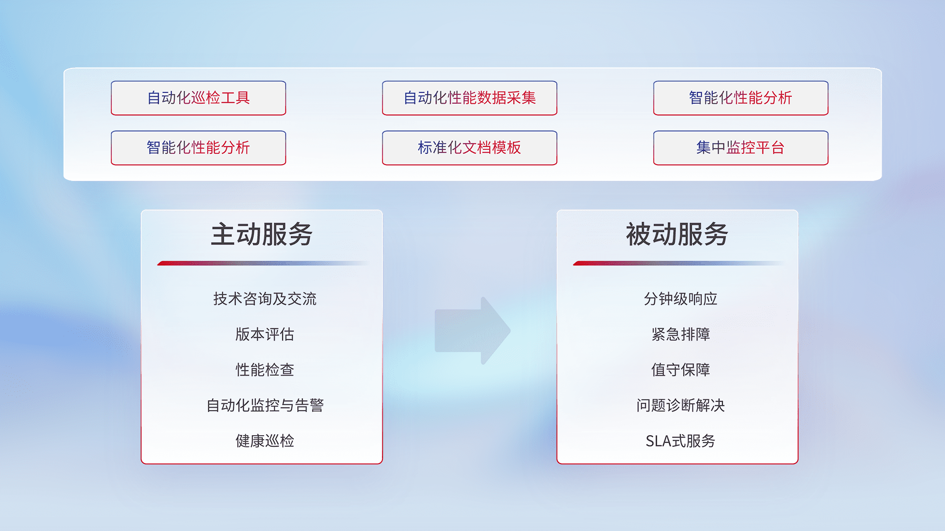 智能化工具和标准化文档,,保障服务质量,,提供主动服务(包含技术咨询、、版本评估、、、性能检查、、自动化监控与告警、、健康巡检)和被动服务包含(分钟级响应、、、紧急排障、、、、值守保障、、、、问题诊断解决、、SLA服务)。。。